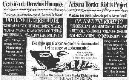 We are armed with video cameras and 'know your rights' cards as we follow and record the actions of the Border Patrol. We witness and document any abuses of authority or violation of human/civil rights. People are targeted by the Border Patrol based solely on skin color and language. We are also concerned with possible violations by law enforcement in their cooperation with the Border Patrol. Help us put a stop to these practices -- join us to peacefully inform people of their rights and oppose these racist and abusive attacks.