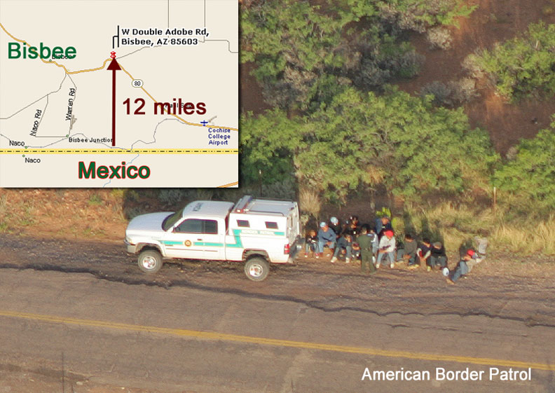 | American Border Patrol snapped this photo of a Border Patrol Agent and thirteen illegal aliens. The location is the corner of Highway 80 and Double Adobe Road in Arizona. This group was able to get past Border Patrol cameras and other devices and make it inland twelve miles before being reported by a citizen. |