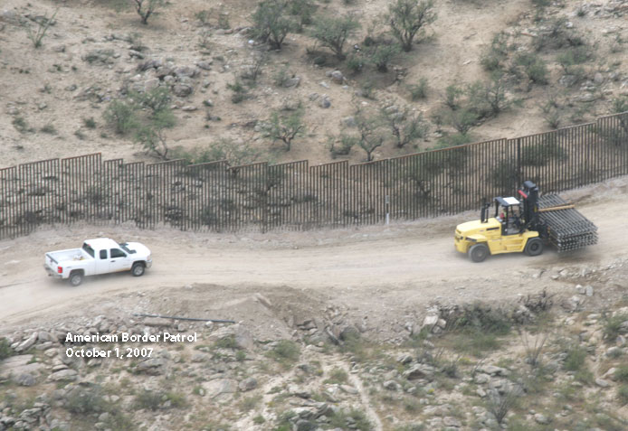 | Aerial photo of section of new fence near Sasabe, Arizona. According to a recent , this fencing costs $4.8 million per mile to construct. "I certainly hope this isn't all they are building," said Glenn Spencer of American Border Patrol, "because at nearly five million dollars a mile, if this is all there is, this contract would have to be mostly profit." American Border Patrol is presently preparing a comprehensive report on border infrastructure development in the past year. |