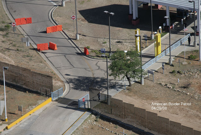 | Photo taken April 29, 2008 by American Border Patrol shows Port of Entry at Sasabe, Arizona. Note what appears to be new radiation detection equipment (yellow). Note also that these can be avoided by turning left, driving around the orange vehicle barriers. |