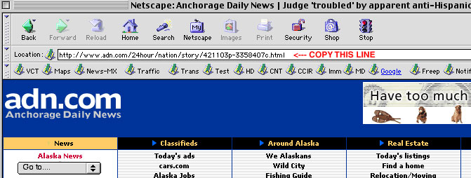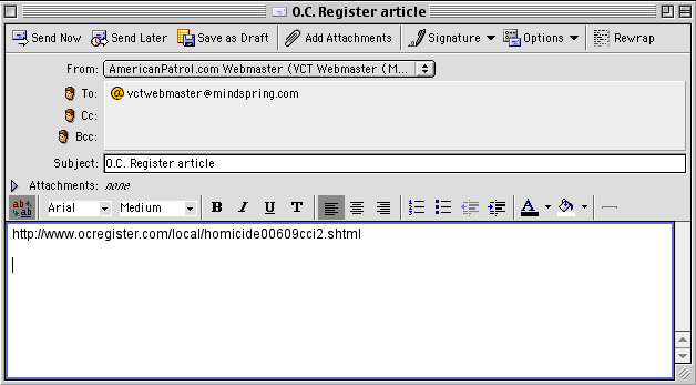 We prefer that you do not send attachments or entire web pages.... just the URL or location of the article you would like us to look at. That information should be copied from the "Location" or "Address" window toward the top of your web browser, then pasted in the body of the e-mail along with any comments you have (see below):